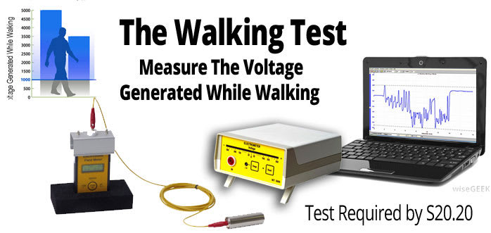 The Walking Test is a required test used to verify ESD floors and ESD footwear are working together as a system. It is possible that a floor and the footwear could function properly when tested separately but do not eliminate static when used together in a real work situation. The walking test is a six step pattern performed to measure the amount of voltage generated on person while walking. It is used to simulate real-world motions of people walking through an ESD protected area. If a floor and ESD footwear system is properly grounding a person, no more than 100 volts will be generated on the body.